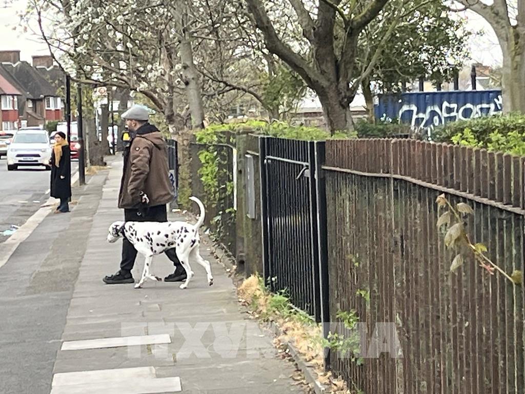 Người dân dắt chó đi dạo trong buổi sáng lạnh tại Tây London. Ảnh: Hương Giang - PV TTXVN tại Anh