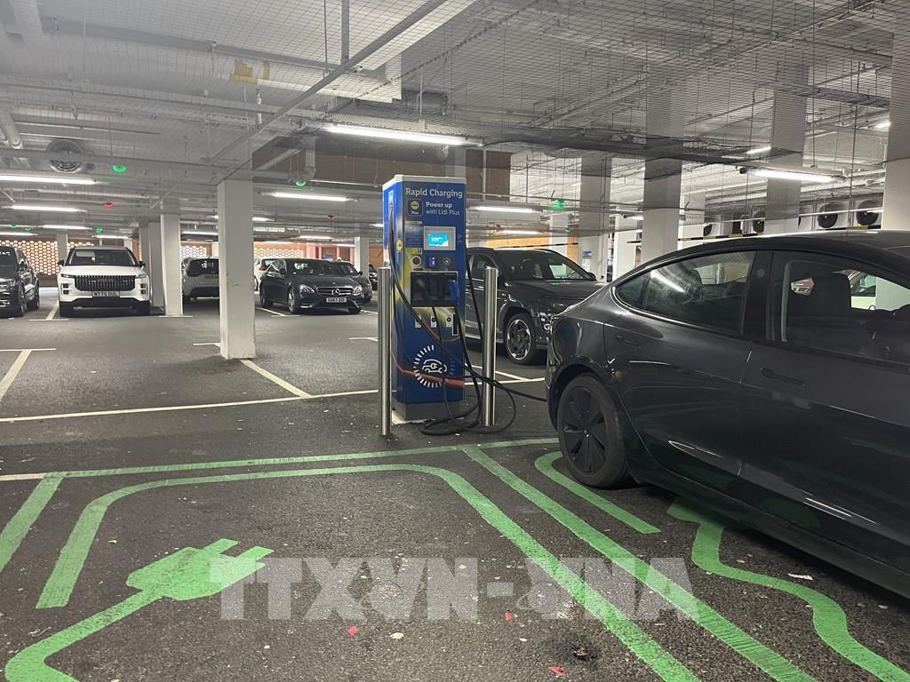 Trạm sạc xe điện tại siêu thị Lidl, London. Ảnh: Hương Giang - PV TTXVN tại Anh