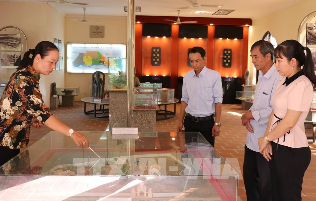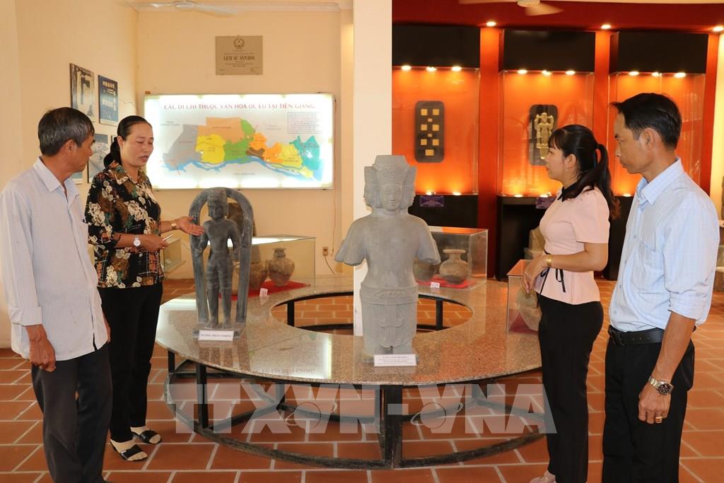 Du khách nghe thuyết minh về hiện vật được khai quật tại Khu di tích lịch sử - văn hóa quốc gia khảo cổ Gò Thành ở xã Tân Thuận Bình, tỉnh Đồng Tháp. Ảnh: Hữu Chí - TTXVN