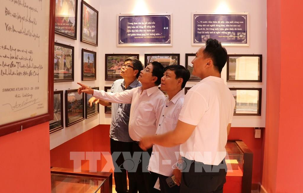 Du khách xem hình ảnh về thân thế và sự nghiệp Anh hùng dân tộc Trương Định tại Đền thờ của ông ở phường Gò Công, tỉnh Đồng Tháp. Ảnh: Hữu Chí - TTXVN