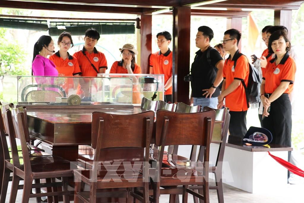 Du khách tham quan mô hình nhà sàn của Chủ tịch Hồ Chí Minh tại Khu Di tích quốc gia đặc biệt “Mộ Cụ Nguyễn Sinh Sắc” ở phường Cao Lãnh, tỉnh Đồng Tháp. Ảnh: Hữu Chí - TTXVN