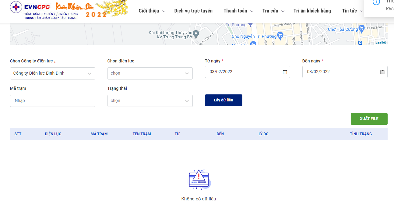 Lịch tạm ngừng cung cấp điện Bình Định ngày mai 3/2 cập nhật lúc 8h40 ngày 2/2 trên website của Tổng Công ty điện lực miền Trung. Ảnh: BNEWS