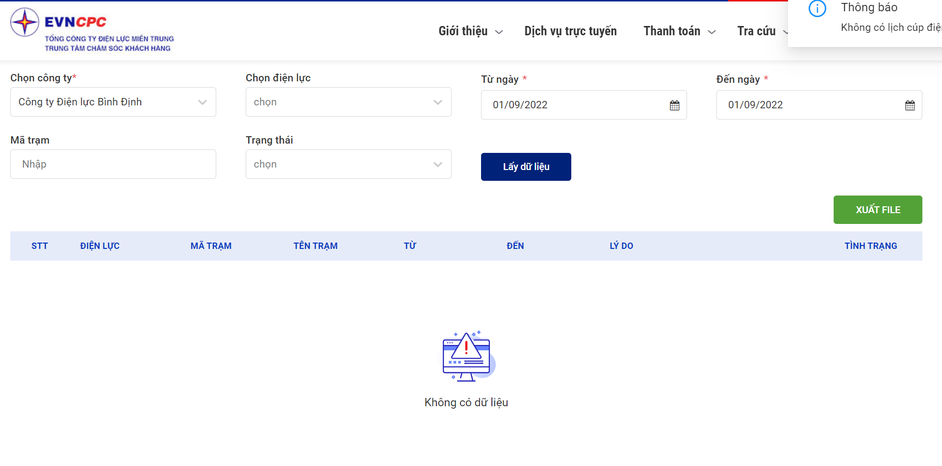 Công ty Điện lực Bình Định thông báo lịch sẽ không tạm ngừng cung cấp điện vào ngày mai 1/9 trên website của Tổng công ty Điện lực miền Trung.