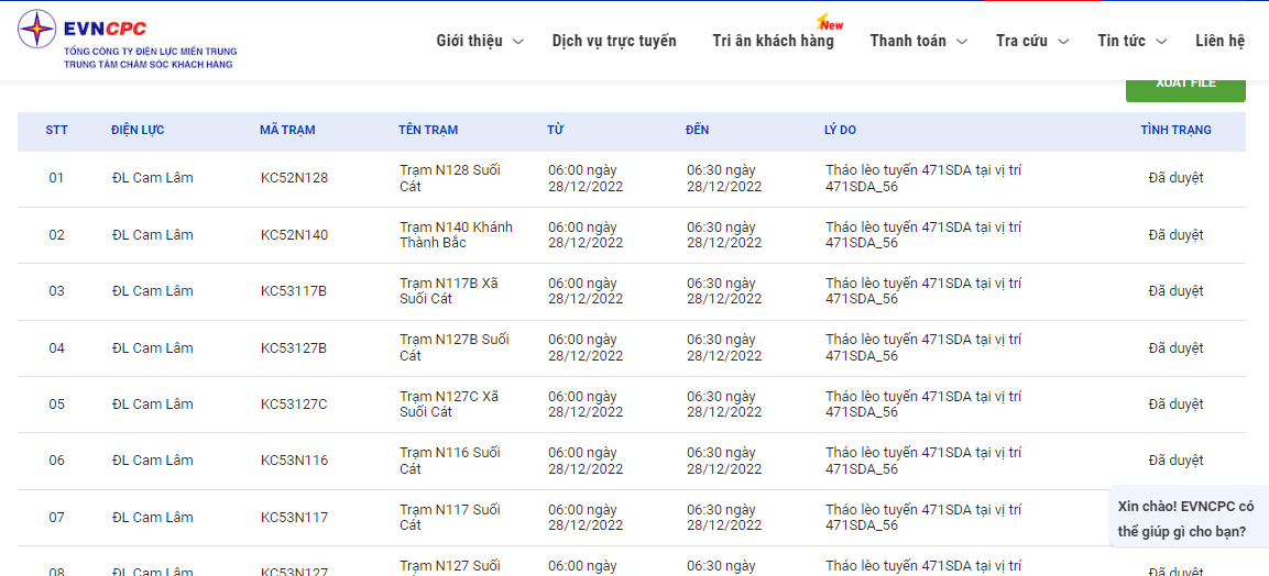 | ĐL Cam Lâm | KC52N140 | Trạm N140 Khánh Thành Bắc | 06:00 28/12/2022 | 06:30 28/12/2022 | Tháo lèo tuyến 471SDA tại vị trí 471SDA_56 | Đã duyệt |