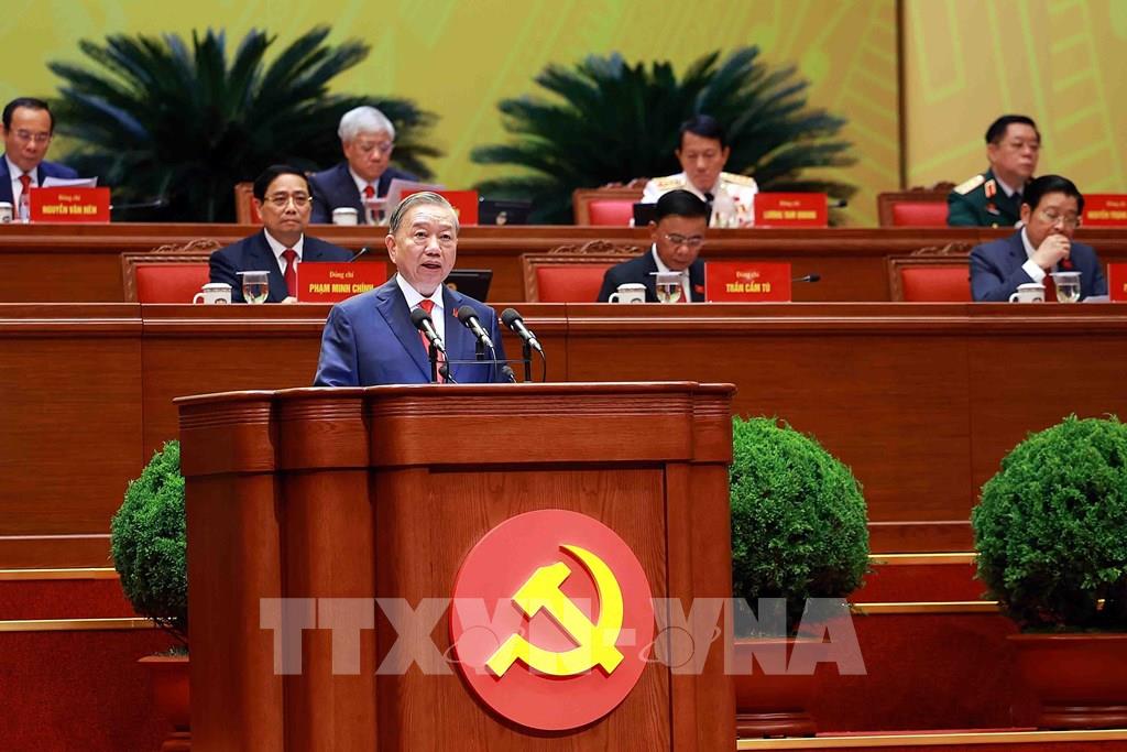 Tổng Bí thư Tô Lâm trình bày Báo cáo của Ban Chấp hành Trung ương Đảng khóa XIII về các văn kiện trình Đại hội XIV của Đảng. Ảnh: TTXVN