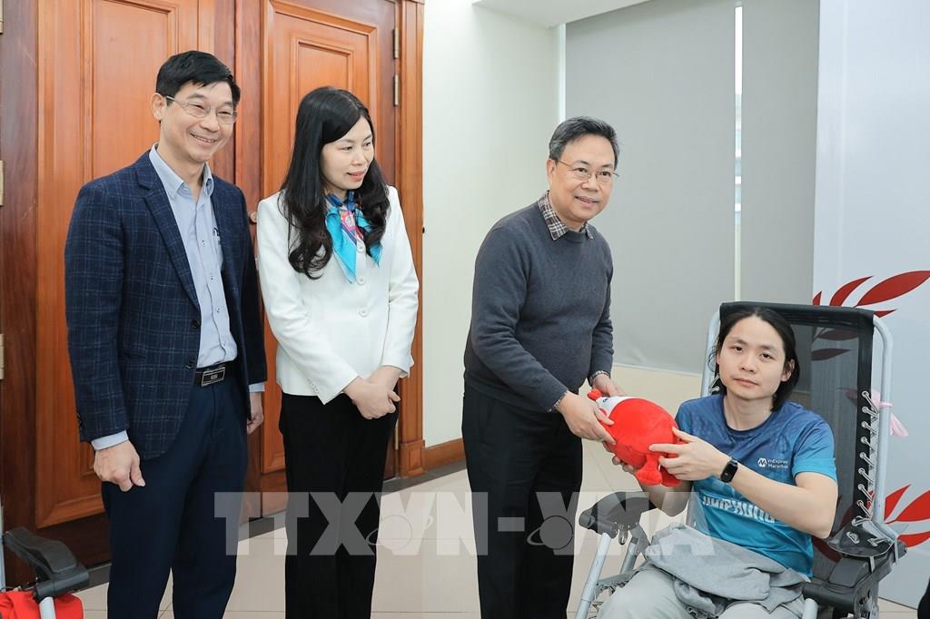 Bà Đỗ Thị Trang, Phó Bí thư chuyên trách Đảng uỷ TTXVN và PGS.TS Nguyễn Hà Thanh, Viện trưởng Viện Huyết học - Truyền máu Trung ương chụp ảnh lưu niệm cùng người hiến máu tình nguyện. Ảnh: Lê Đông - TTXVN