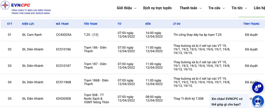 Để theo dõi lịch cắt điện tại tỉnh Khánh Hòa, người dân có thể truy cập: