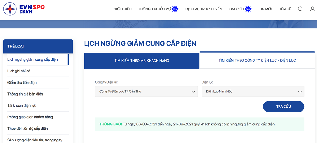 Lịch cung cấp điện Cần Thơ cập nhật lúc 11h30 ngày 6/8 tại website của EVNSPC. Ảnh: BNEWS