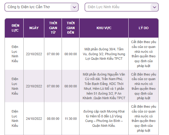 | Điện Lực Ninh Kiều | 22/10/2022 | 7:00:00 | 8:00:00 | Một phần đường 30/4, Tầm Vu, đường 3/2, Phường hưng Lợi Quận Ninh Kiều TPCT | Cắt điện theo yêu cầu của cơ quan nhà nước có thẩm quyền theo quy định của pháp luật |