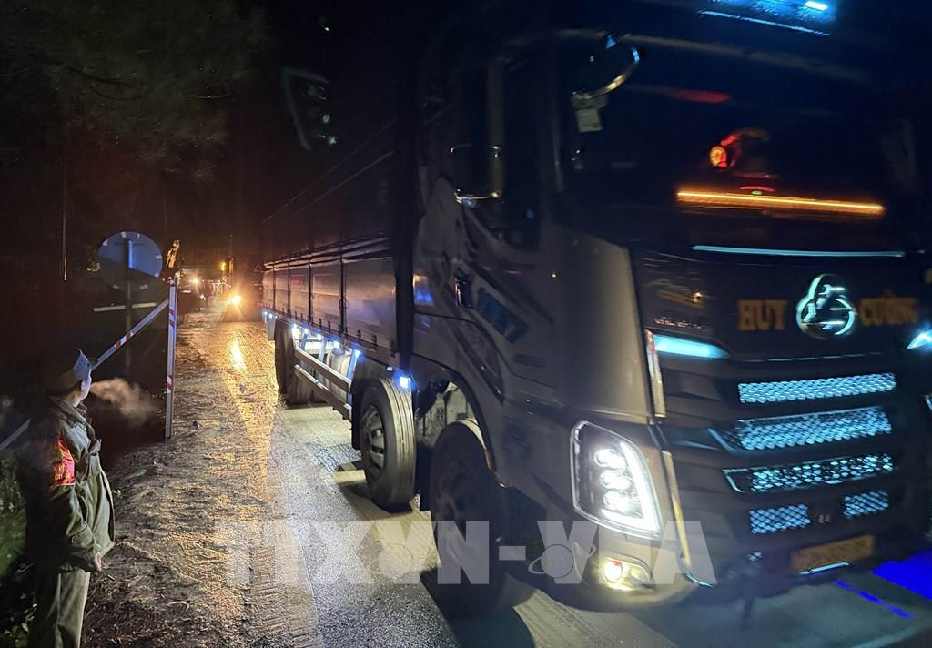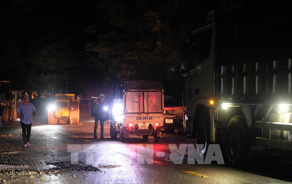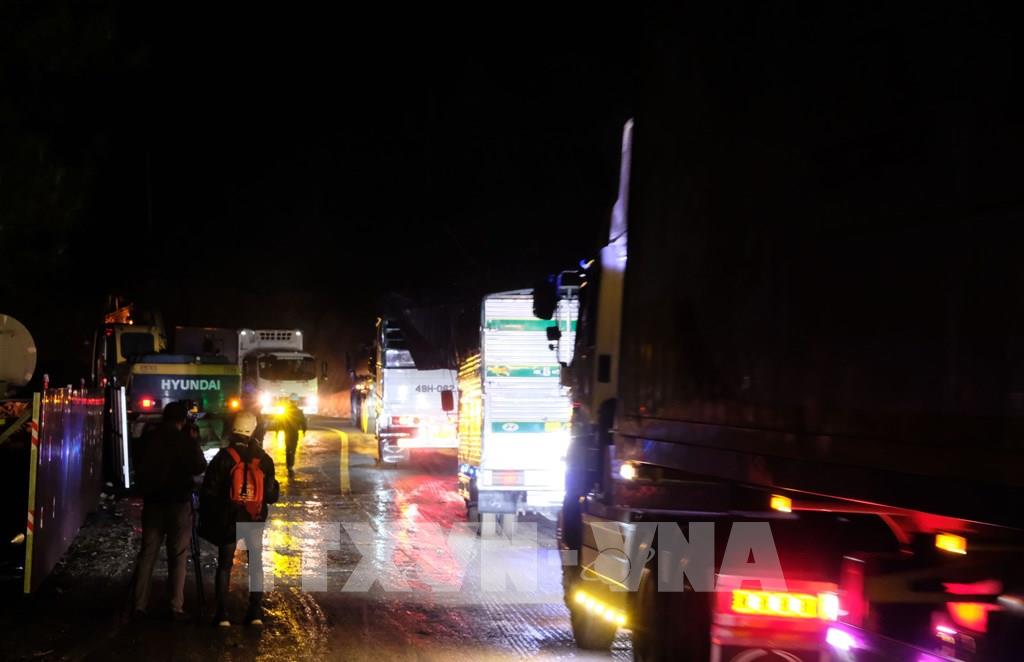 Từ 18 giờ ngày 30/11, các phương tiện bắt đầu lưu thông qua đoạn đường thay thế cho vị trí bị đứt gãy. Ảnh: Nguyễn Dũng – TTXVN