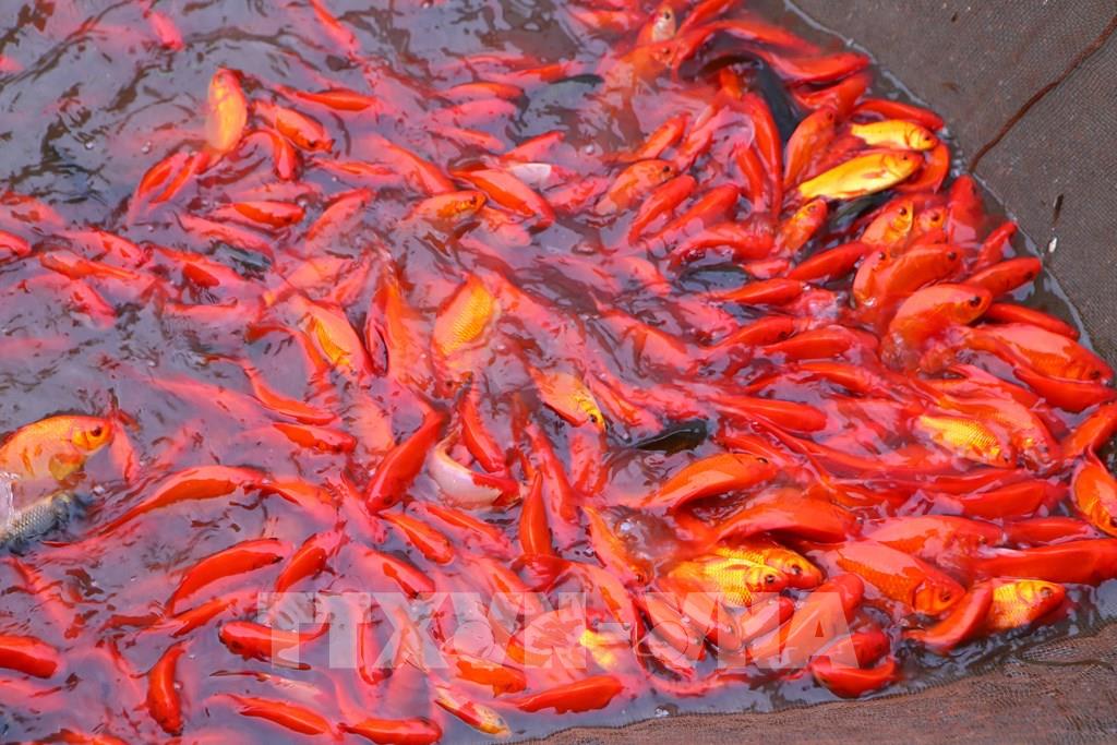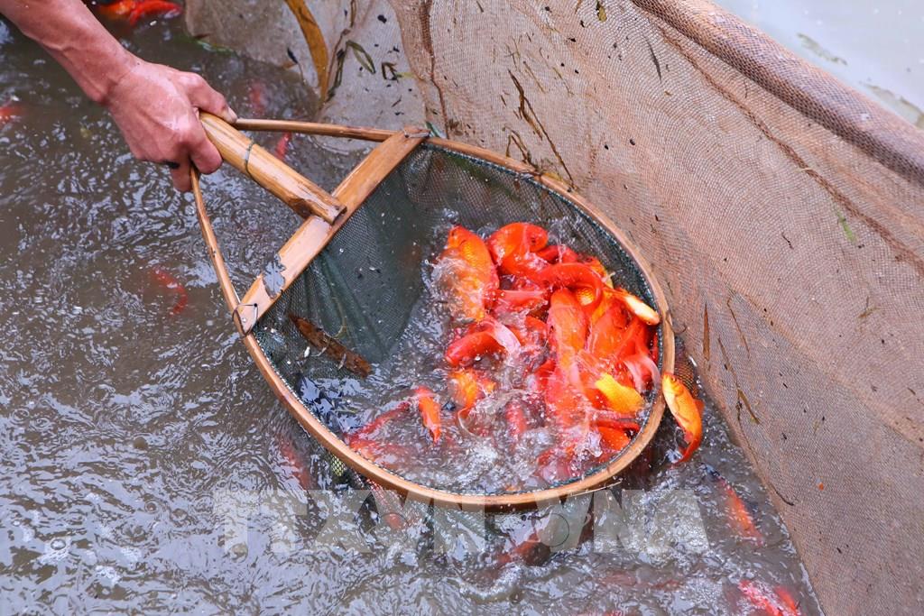 Bên cạnh việc nuôi các loại cá cảnh, nhiều năm trở lại đây, anh Phan Văn Dũng, Tổ dân phố Thượng Trang cũng nuôi thêm cá chép để phục vụ nhu cầu thị trường dịp Tết ông Công ông Táo. Năm nay ngoài giống cá chép đỏ truyền thống, anh còn nuôi thêm giống cá chép Tam Dương để đa dạng hóa nguồn cung. Anh Phan Văn Dũng cho biết, anh đã nuôi cá chép khoảng 15 năm nay trên diện tích 20 sào ao của gia đình và một số ao đấu thầu. Năm nay thời tiết ủng hộ, cá phát triển tốt, sản lượng ước đạt khoảng 5 tấn. Thị trường tiêu thụ cá năm nay tương đối lớn, ngay từ tháng 11 (âm lịch) đã có nhiều thương lái đến đặt hàng, hiện gia đình đã bán được khoảng 50% sản lượng, số còn lại từ nay đến ngày 21 tháng Chạp, các thương lái sẽ vận chuyển hết đi tiêu thụ.Phát huy lợi thế mặt nước sông Hồng, những năm gần đây, bên cạnh việc nuôi các loại cá truyền thống như cá diêu hồng, cá lăng, cá Koi (chép Nhật), ông Phan Văn Sơn còn bố trí khoảng hai lồng nuôi cá chép đỏ trên sông. So với nuôi ao, mô hình nuôi cá chép đỏ trên sông tận dụng được dòng chảy tự nhiên, giúp giảm chi phí thức ăn do cá có thể sử dụng nguồn thức ăn sẵn có ngoài môi trường. Nhờ đó, cá sinh trưởng ổn định, khi xuất bán đạt kích cỡ khoảng hai ngón tay, phù hợp với thị hiếu của người tiêu dùng.