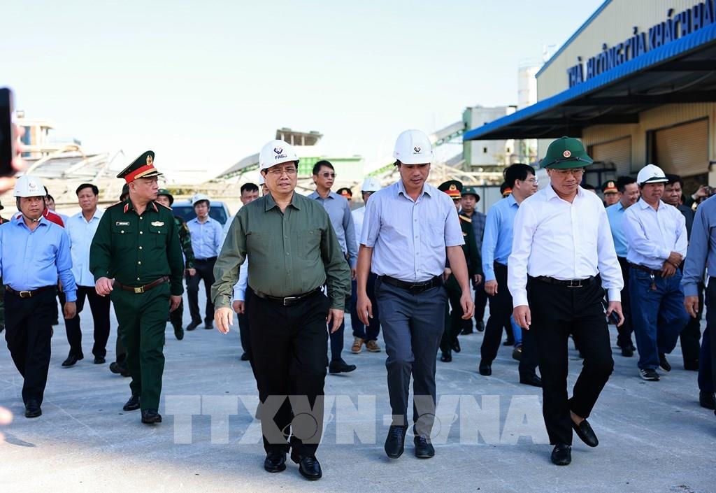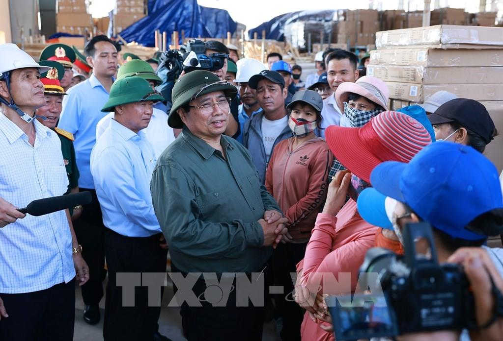 Thủ tướng Phạm Minh Chính thăm các cơ sở sản xuất bị thiệt hại do bão số 13 tại Khu kinh tế Nhơn Hội. Ảnh: Dương Giang-TTXVN