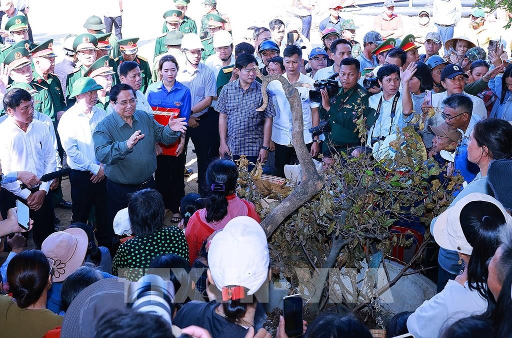 Thủ tướng Phạm Minh Chính thăm, động viên các hộ dân bị ảnh hưởng triều cường tại xã Đề Gi. Ảnh: Dương Giang-TTXVN