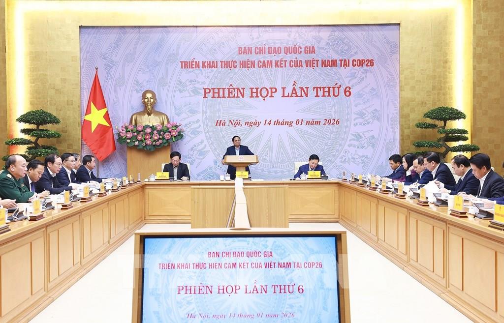 Thủ tướng Phạm Minh Chính chủ trì phiên họp lần thứ 6 BCĐ thực hiện cam kết của Việt Nam tại COP 26. Ảnh: Dương Giang-TTXVN