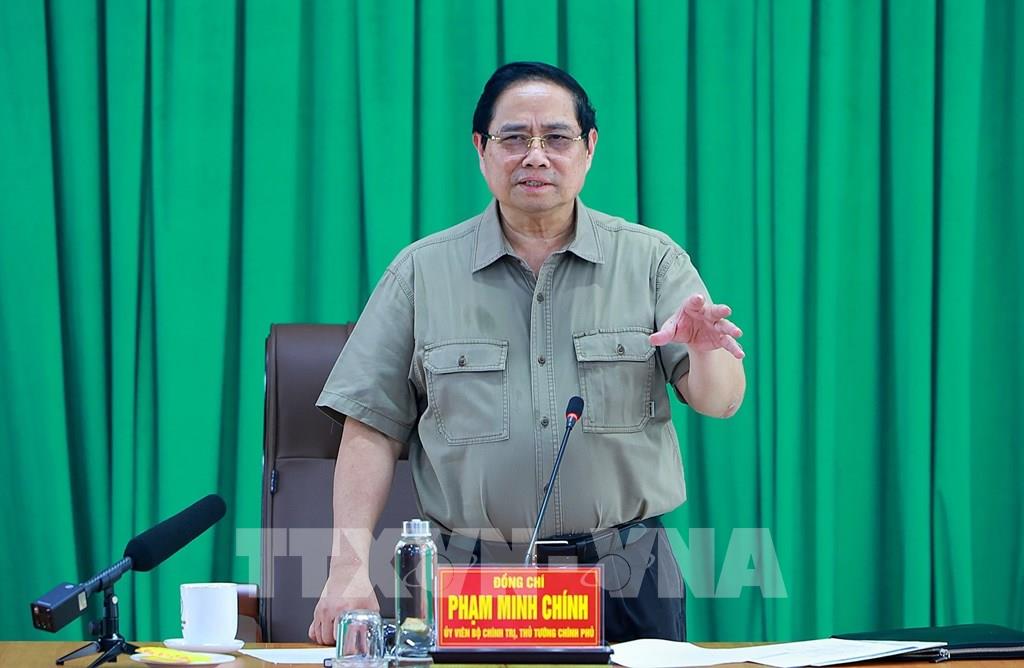 Thủ tướng Phạm Minh Chính làm việc với các nhà thầu, đơn vị thi công dự án cao tốc Cà Mau - Đất Mũi và Tuyến đường ra đảo Hòn Khoai. Ảnh: Dương Giang-TTXVN