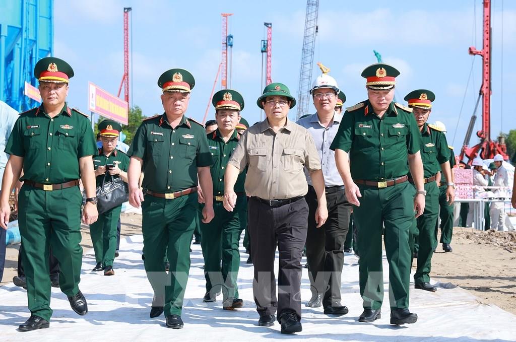 Thủ tướng Phạm Minh Chính kiểm tra tiến độ thi công tuyến giao thông ra đảo Hòn Khoai và Cảng tổng hợp lưỡng dụng Hòn Khoai. Ảnh: Dương Giang-TTXVN