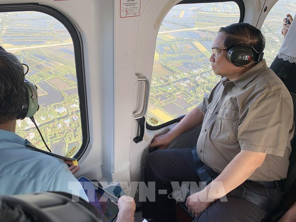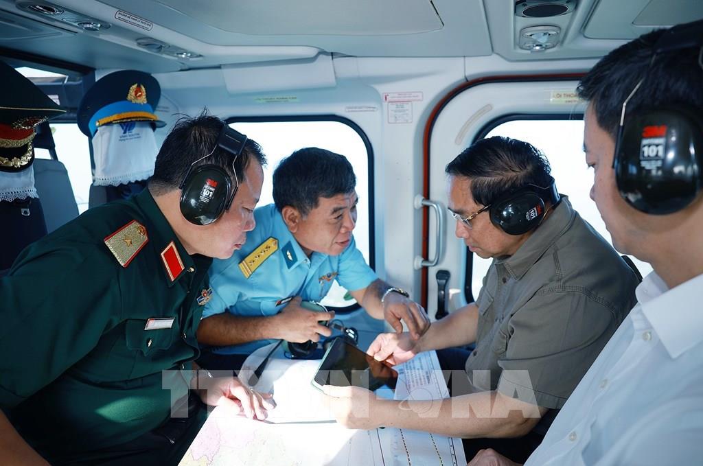 Thủ tướng Phạm Minh Chính thị sát tuyến đường bộ cao tốc Cà Mau – Đất Mũi, tuyến giao thông ra đảo Hòn Khoai và Cảng tổng hợp lưỡng dụng Hòn Khoai từ trực thăng. Ảnh: Dương Giang-TTXVN