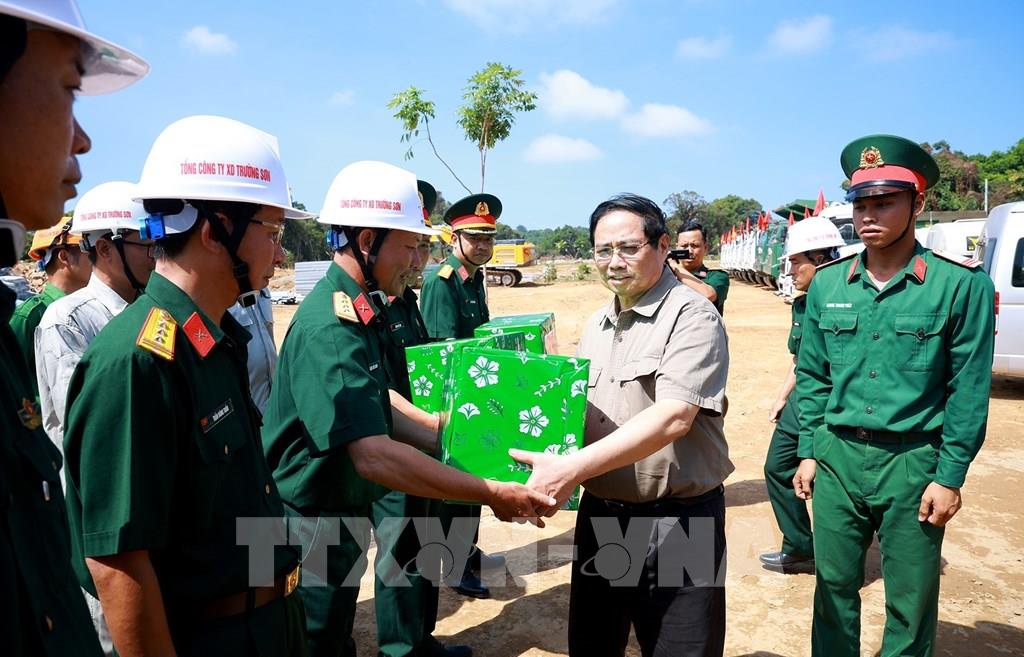 Thủ tướng Phạm Minh Chính đến thăm, động viên các đơn vị thi công và kiểm tra tiến độ dự án xây dựng sân bay và hạ tầng đảo Thổ Chu thuộc đặc khu Thổ Châu, tỉnh An Giang. Ảnh: Dương Giang-TTXVN