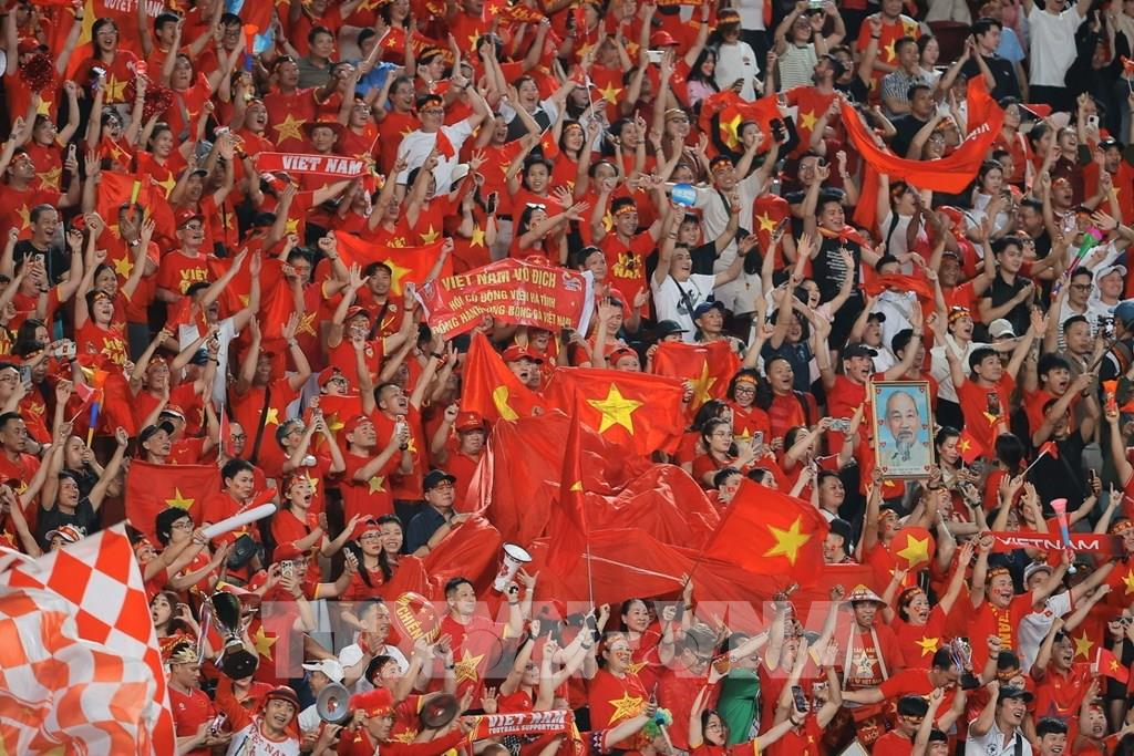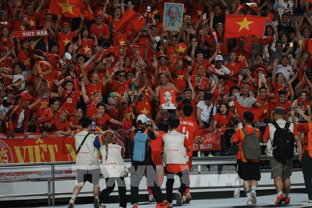 Niềm vui tột độ của người hâm mộ Việt Nam trên sân Rajamangala khi đội nhà giành chiến thắng. Ảnh: Minh Quyết - PV TTXVN tại Thái Lan