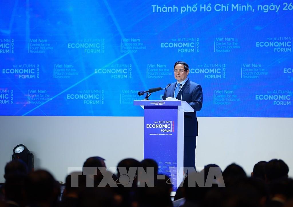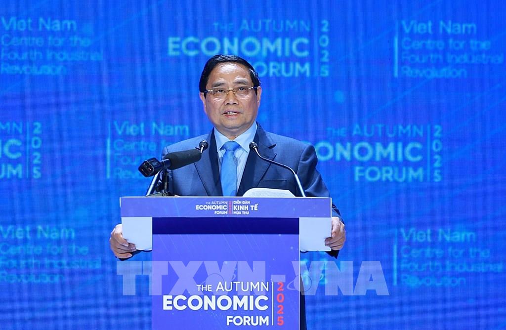 Thủ tướng Phạm Minh Chính phát biểu tại Diễn đàn Kinh tế mùa Thu 2025. Ảnh: Dương Giang-TTXVN