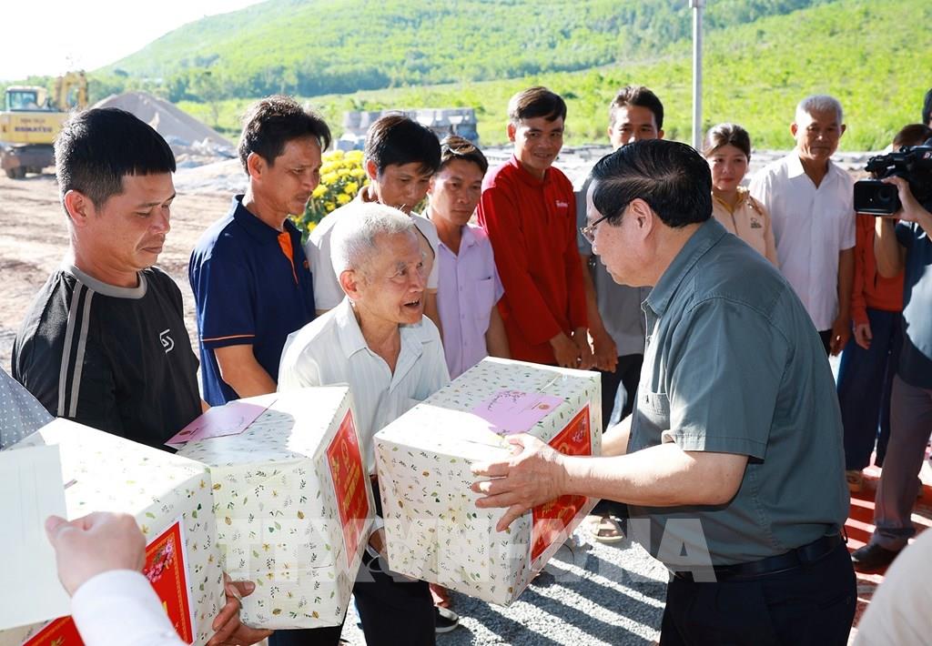 Thủ tướng Phạm Minh Chính tặng quà cho nhân dân Khu Tái định cư xã Tuy An Tây và Tuy An Nam, tỉnh Đắk Lắk. Ảnh: Dương Giang-TTXVN