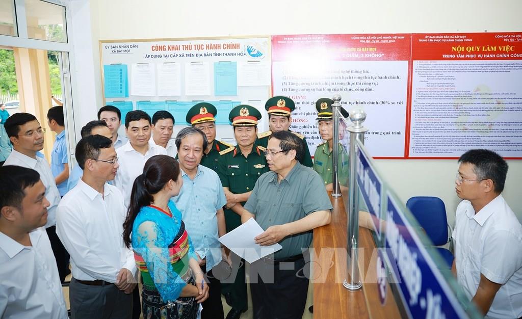 Thủ tướng Phạm Minh Chính yêu cầu Trung tâm hành chính xã Bát Mọt nói riêng và các Trung tâm hành chính công cấp xã ở Thanh Hóa tiếp tục đẩy mạnh tích hợp, liên thông dữ liệu; đẩy mạnh phong trào bình dân học vụ số, hướng dẫn người dân về chuyển đổi số, qua đó thúc đẩy hình thành công dân số, tạo phong trào xu thế, thói quen cho người dân trong chuyển đổi số và làm thủ tục trực tuyến, từ đó giảm thời gian đi lại, giảm chi phí tuân thủ cho người dân, nhất là với vùng sâu, vùng xa. Đồng thời, cần tiếp tục hoàn thiện hạ tầng công nghệ số, khắc phục các điểm lõm sóng, lõm điện.