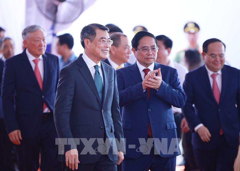 Thủ tướng Lê Minh Hưng và nguyên Thủ tướng Phạm Minh Chính đến dự Lễ khởi công Dự án tuyến đường sắt tốc độ cao Hà Nội-Quảng Ninh. Ảnh: Dương Giang-TTXVN