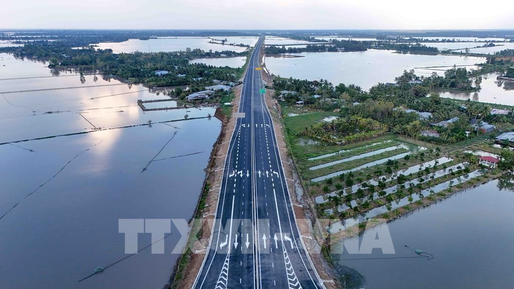 Toàn cảnh một đoạn thẳng dài của cao tốc Cần Thơ – Cà Mau chạy giữa khu vực ruộng lúa, vườn cây. Tuyến đường thể hiện rõ quy mô và tính kết nối liên vùng. Ảnh: Thanh Liêm - TTXVN