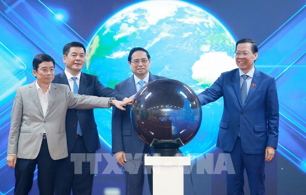 Thủ tướng Phạm Minh Chính và các đại biểu thực hiện nghi thức công bố kết quả xuất nhập khẩu năm 2025. Ảnh: Dương Giang-TTXVN