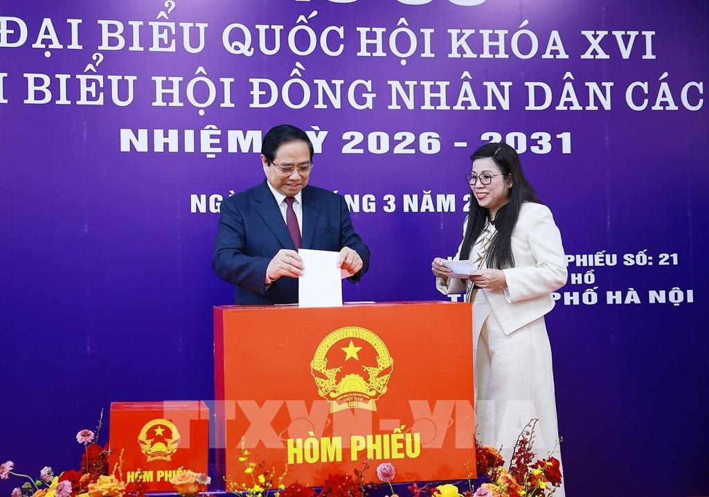 Đúng 7 giờ sáng 15/3, hòa chung ngày hội lớn với gần 79 triệu cử tri trên khắp mọi miền đất nước, tại Khu vực bỏ phiếu số 21, phường Tây Hồ, Hà Nội, Thủ tướng Chính phủ Phạm Minh Chính thực hiện quyền và nghĩa vụ công dân, bỏ phiếu đầu tiên lựa chọn những người xứng đáng nhất làm đại biểu Quốc hội khóa XVI và đại biểu HĐND các cấp nhiệm kỳ 2026-2031.