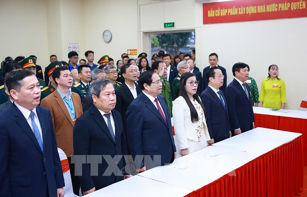 Thủ tướng Phạm Minh Chính và Phu nhân cùng các cử tri thực hiện nghi thức chào cờ, khai mạc bầu cử tại Khu vực bỏ phiếu số 21 phường Tây Hồ, thành phố Hà Nội. Ảnh: Dương Giang-TTXVN