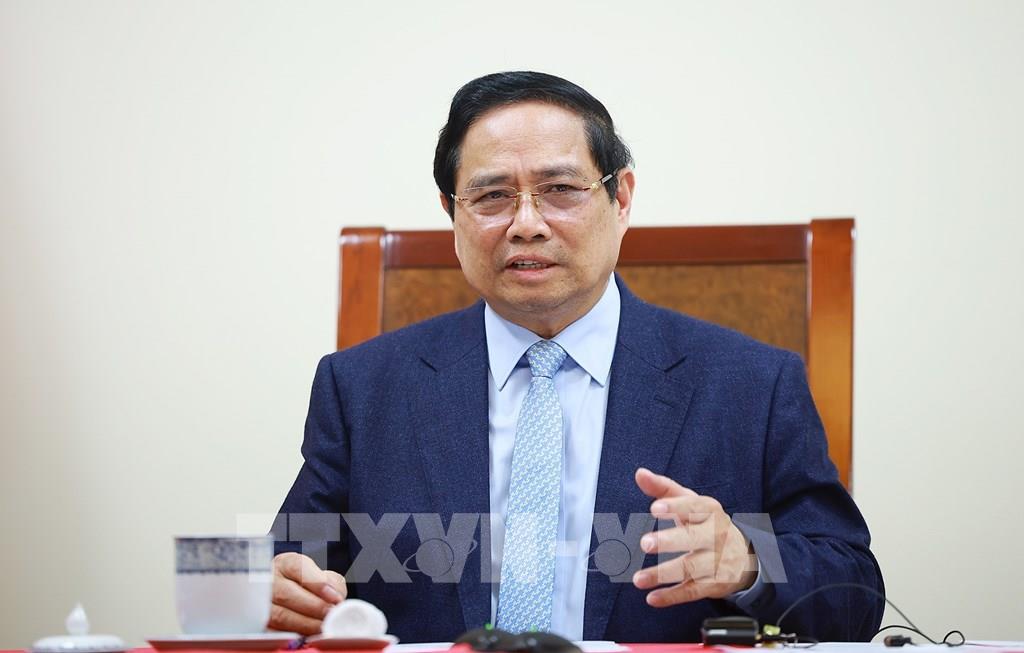 Thủ tướng Phạm Minh Chính điện đàm với Thủ tướng Qatar Sheikh Mohammed bin Abdulrahman Al Thani. Ảnh: Dương Giang - TTXVN