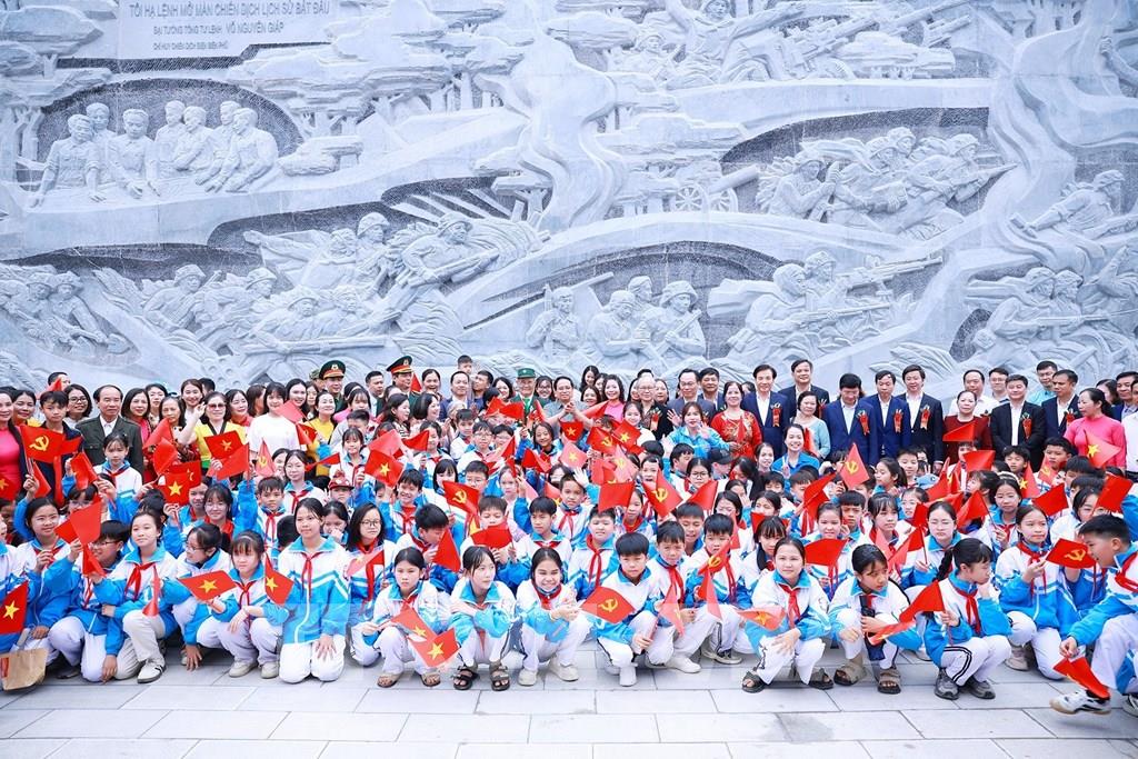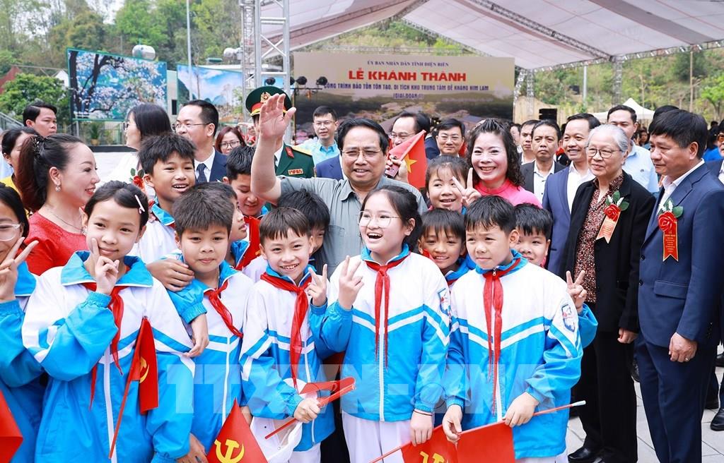 Thủ tướng Phạm Minh Chính với học sinh tỉnh Điện Biên tham dự Lễ khánh thành. Ảnh: Dương Giang-TTXVN