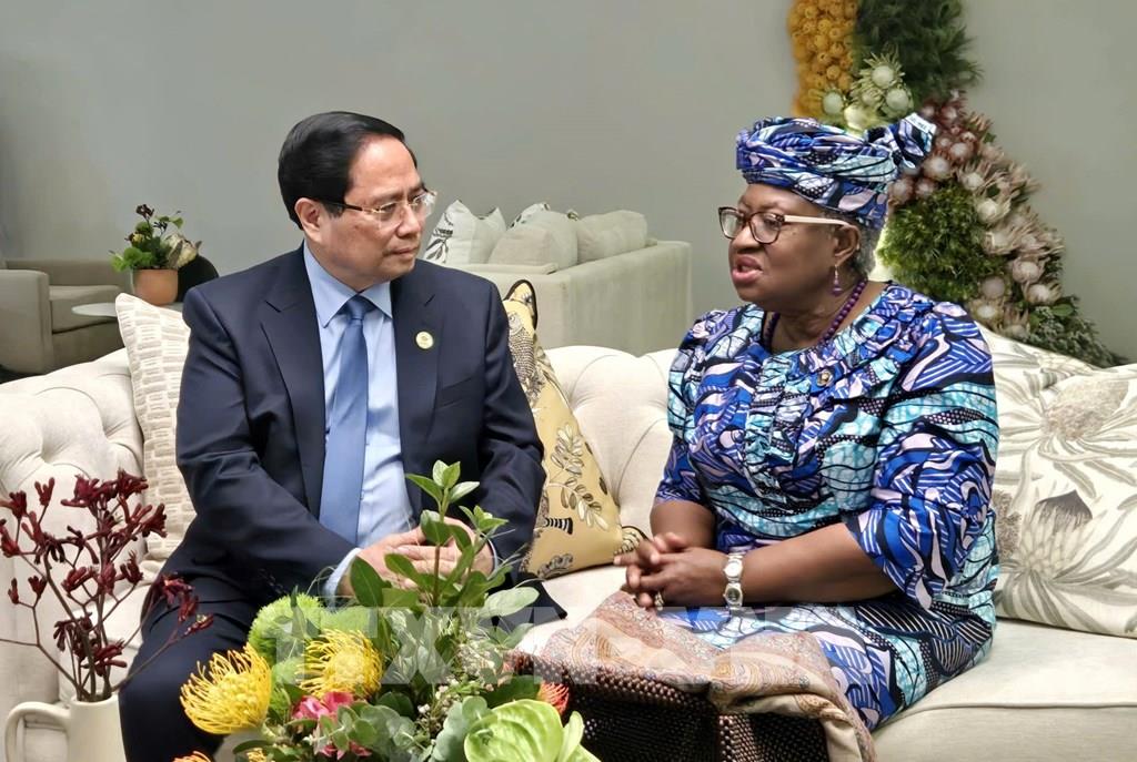 Thủ tướng Phạm Minh Chính gặp bà Ngozi Okonjo-Iweala, Tổng Giám đốc Tổ chức Thương mại Thế giới (WTO). Ảnh: TTXVN phát