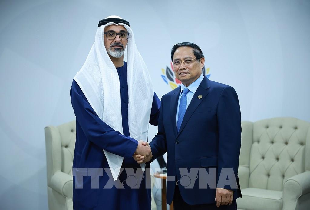 Thủ tướng Phạm Minh Chính gặp Hoàng Thái tử Abu Dhabi thuộc Các Tiểu vương quốc Ả Rập Thống nhất (UAE) Khaled bin Mohamed bin Zayed Al Nahyan. Ảnh: Dương Giang-TTXVN