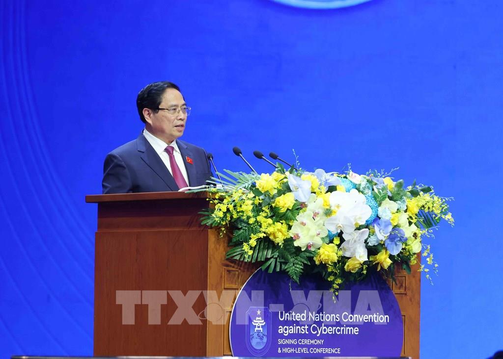 Thủ tướng cho biết, với nhận thức “không một quốc gia nào đủ mạnh để đơn độc chống lại tội phạm mạng”, Việt Nam luôn thể hiện tinh thần chủ động, trách nhiệm, luôn luôn sẵn sàng để đóng góp vào mục tiêu bảo đảm an ninh mạng toàn cầu. Việc tham gia, thúc đẩy và đăng cai tổ chức Lễ mở ký Hà Nội là minh chứng quan trọng cho cam kết và nỗ lực này. Thủ tướng Chính phủ cho rằng, Công ước Hà Nội không chỉ là một văn bản pháp lý, mà còn là một tuyên ngôn khẳng định hòa bình, an ninh, thịnh vượng trong thế kỷ XXI phải được bắt đầu tư một không gian mạng an toàn. Xuất phát từ lý do đó, Thủ tướng kêu gọi các quốc gia cùng chung tay thực hiện tinh thần “5 đẩy mạnh”: Thứ nhất, đẩy mạnh hợp tác quốc tế, thiết lập mạng lưới đối tác chặt chẽ giữa các quốc gia, tổ chức quốc tế và các tập đoàn công nghệ lớn. Thứ hai, đẩy mạnh hoàn thiện khuôn khổ pháp lý quốc gia phù hợp với Công ước. Thứ ba, đẩy mạnh hợp tác đầu tư vào hạ tầng kỹ thuật an ninh mạng. Thứ tư, đẩy mạnh phát triển nguồn nhân lực chuyên trách, nâng cao năng lực điều tra, ứng phó và xử lý tội phạm mạng. Thứ năm, đẩy mạnh tham gia khuôn khổ pháp lý quốc tế về không gian mạng.Theo Thủ tướng, tinh thần “5 đẩy mạnh” sẽ là lời kêu gọi hành động chung của thời đại để Công ước Hà Nội thực sự trở thành nguồn cảm hứng cho hợp tác toàn cầu, niềm tin và trách nhiệm chung của nhân loại trong việc bảo vệ tương lai số.