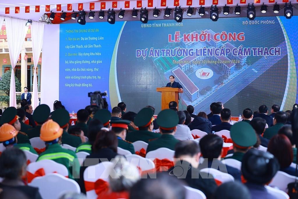 Thủ tướng Phạm Minh Chính và các đại biểu khởi công dự án Trường liên cấp Cẩm Thạch, Thanh Hoá. Ảnh: Dương Giang-TTXVN