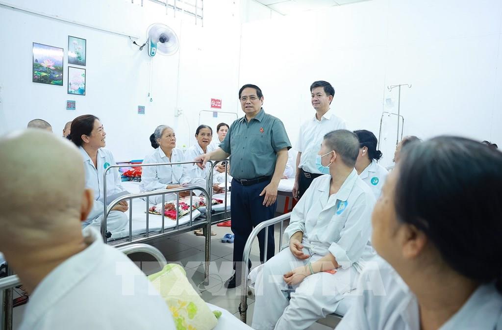 Thủ tướng Phạm Minh Chính thăm, tặng quà động viên bệnh nhân đang điều trị tại Bệnh viện Ung bướu thành phố Cần Thơ. Ảnh: Dương Giang-TTXVN