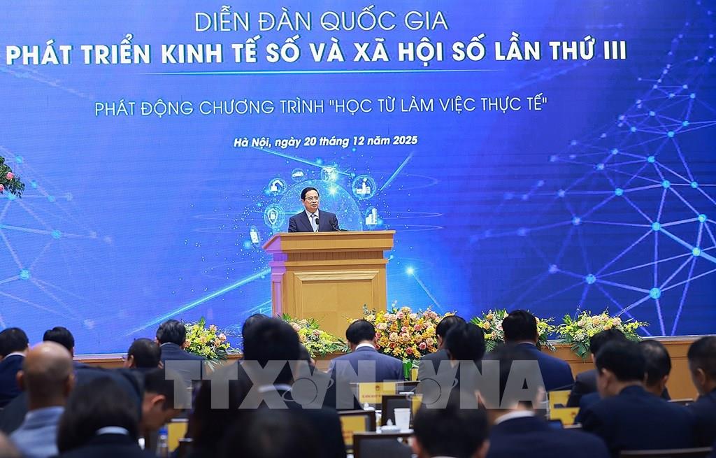 Thủ tướng Phạm Minh Chính phát biểu chỉ đạo tại Diễn đàn Quốc gia phát triển kinh tế số và xã hội số lần thứ III. Ảnh: Dương Giang – TTXVN