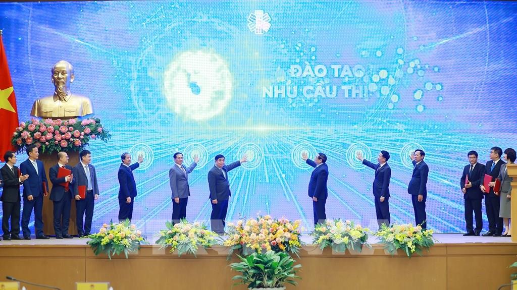 Thủ tướng Phạm Minh Chính và các đại biểu phát động Chương trình “Học từ làm việc thực tế” và chứng kiến trao biên bản hợp tác giữa nhà nước – nhà trường – doanh nghiệp. Ảnh: Dương Giang-TTXVN