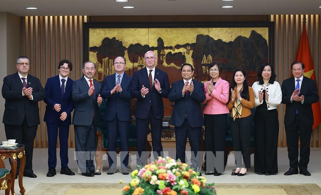 Thủ tướng Phạm Minh Chính và Tổng giám đốc Hãng Thông tấn TASS (Liên bang Nga) Andrey Kondrashov cùng thành viên đoàn hai nước. Ảnh: Dương Giang-TTXVN