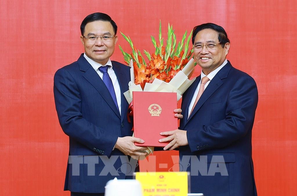 Thủ tướng Phạm Minh Chính trao Quyết định Quyền Bộ trưởng Bộ Công Thương cho đồng chí Lê Mạnh Hùng. Ảnh: Dương Giang-TTXVN