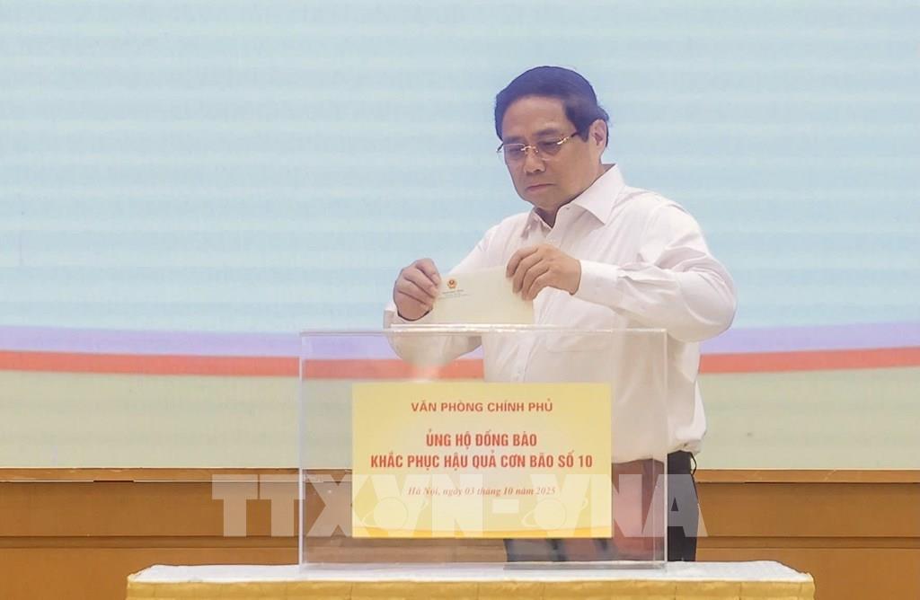 Sáng 3/10, tại Trụ sở Chính phủ, Thủ tướng Phạm Minh Chính cùng các Phó Thủ tướng, Phó Bí thư Đảng ủy Chính phủ, tập thể Văn phòng Chính phủ và cơ quan giúp việc Đảng ủy Chính phủ đã tham gia ủng hộ đồng bào bị thiệt hại do bão, lũ gây ra với tinh thần tương thân, tương ái, tình dân tộc, nghĩa đồng bào, “lá lành đùm lá rách”, ít nhất mỗi người một ngày lương.
