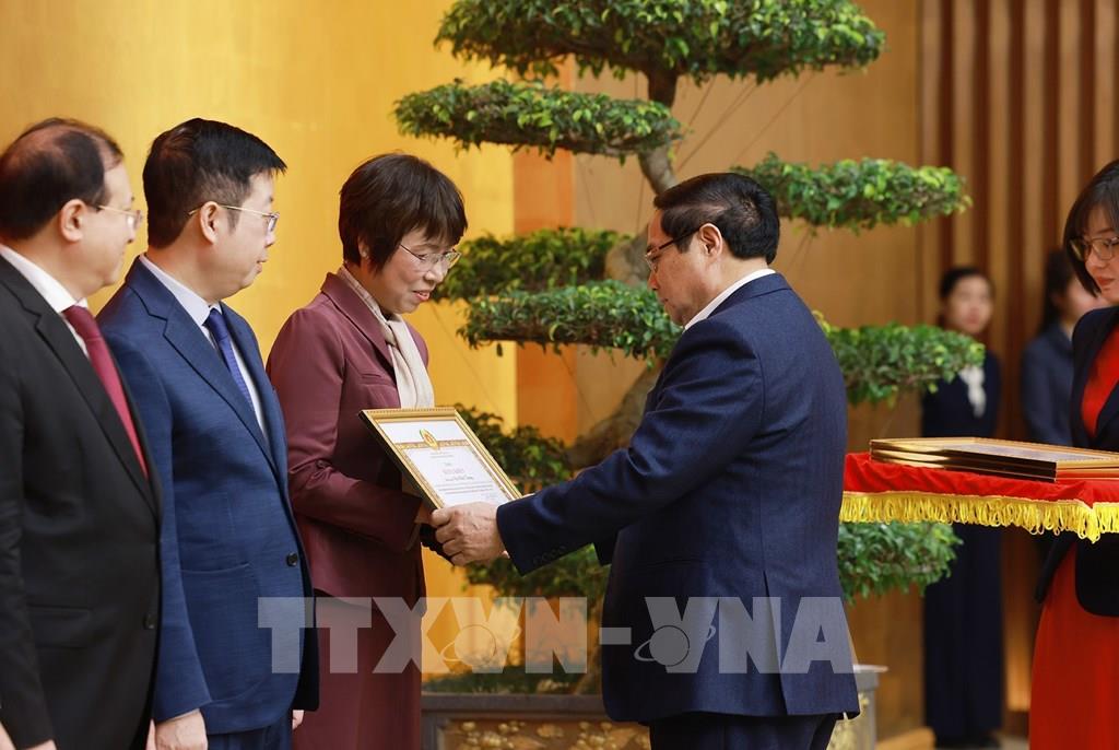 Thủ tướng Phạm Minh Chính trao Bằng khen của Ban Chấp hành Đảng bộ Chính phủ cho đồng chí Vũ Việt Trang, Tổng Giám đốc Thông tấn xã Việt Nam. Ảnh: Dương Giang-TTXVN