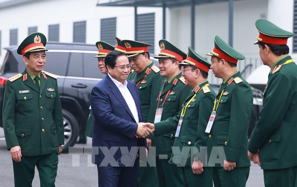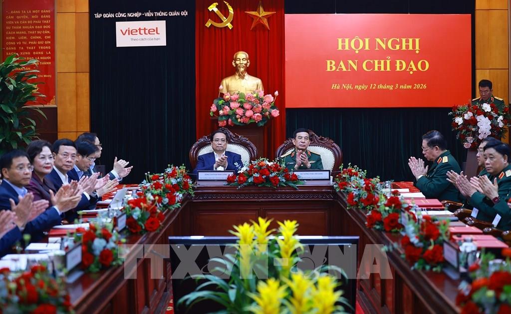 Thủ tướng Phạm Minh Chính với lãnh đạo Tập đoàn Công nghiệp - Viễn thông Quân đội. Ảnh: Dương Giang-TTXVN
