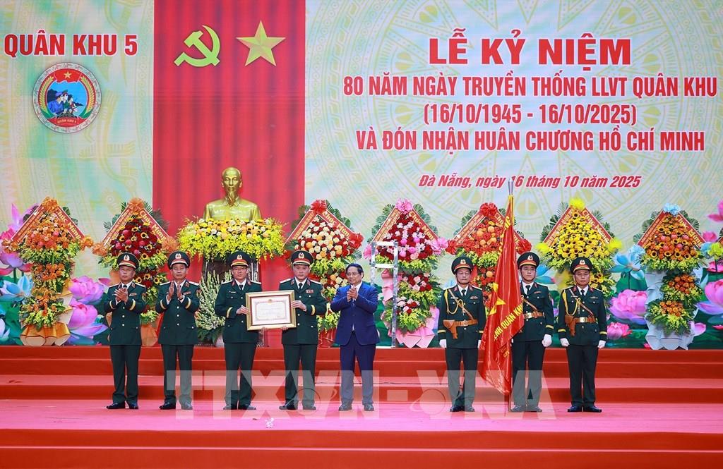 Chiều 16/10, tại thành phố Đà Nẵng, Ủy viên Bộ Chính trị, Thủ tướng Chính phủ Phạm Minh Chính dự Lễ kỷ niệm 80 năm Ngày truyền thống Lực lượng vũ trang Quân khu 5 (16/10/1945 - 16/10/2025) và đón nhận Huân chương Hồ Chí Minh lần thứ 3 - phần thưởng cao quý của Đảng, Nhà nước ghi nhận quá trình xây dựng, chiến đấu, chiến thắng và trưởng thành của Quân khu 5 trong suốt chặng đường 80 năm qua.