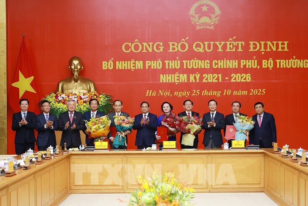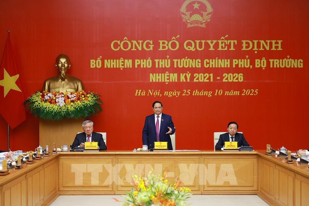Bí thư Đảng ủy Chính phủ, Thủ tướng Chính phủ Phạm Minh Chính trao quyết định bổ nhiệm Phó Thủ tướng Chính phủ, Bộ trưởng nhiệm kỳ 2021 - 2026. Ảnh: Dương Giang-TTXVN