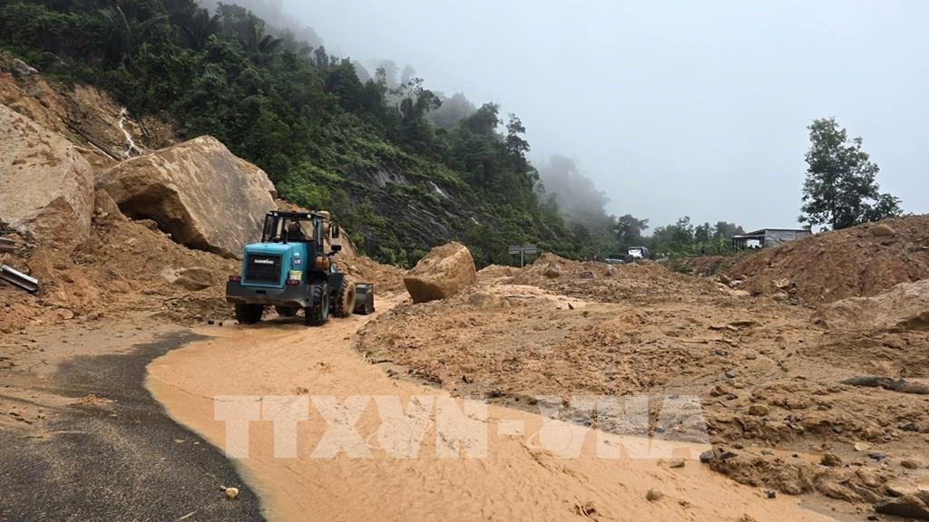 Lực lượng chức năng tỉnh Khánh Hòa huy động thiết bị cơ giới dọn dẹp đất đá bị sạt lở để tiếp cận hiện trường đưa nạn nhân ra ngoài. Ảnh: Đặng Tuấn - TTXVN