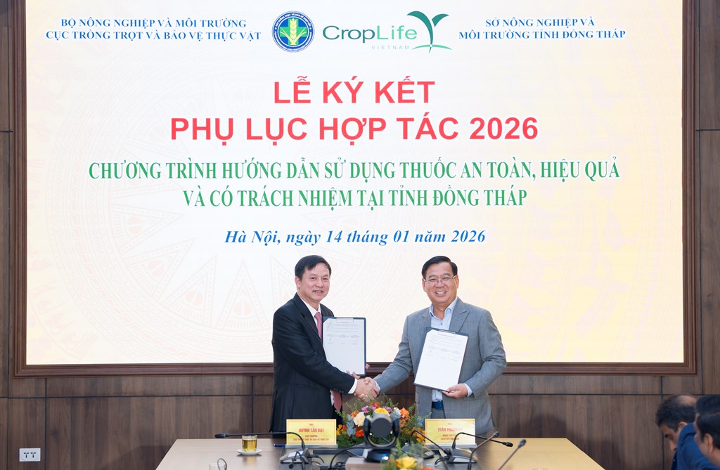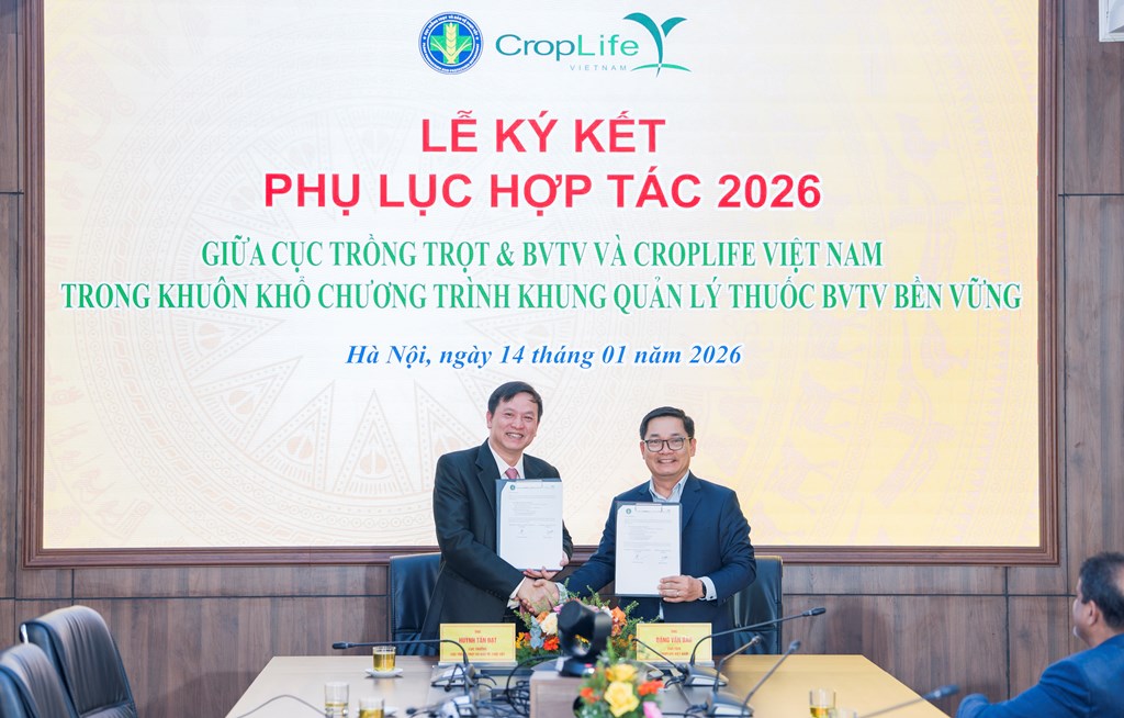 Chiều 14/1, tại Hà Nội, Cục Trồng trọt và Bảo vệ thực vật (Bộ Nông nghiệp và Môi trường) và Hiệp hội CropLife Việt Nam đã ký kết Phụ lục hoạt động hợp tác triển khai Chương trình “Khung quản lý thuốc bảo vệ thực vật bền vững” năm 2026, tiếp nối Chương trình Khung quản lý thuốc bảo vệ thực vật bền vững giai đoạn 2023–2028 giữa hai bên.