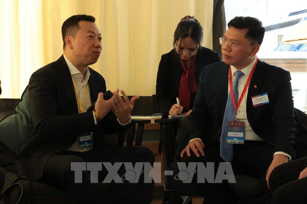 Ông Hoàng Nguyên Dinh, Phó Chủ tịch UBND Thành phố Hồ Chí Minh, thảo luận bên lề với ông Kaiser Ng, CFO của nền tảng Binance. Ảnh: Anh Hiển - PV TTXVN tại Thụy Sĩ